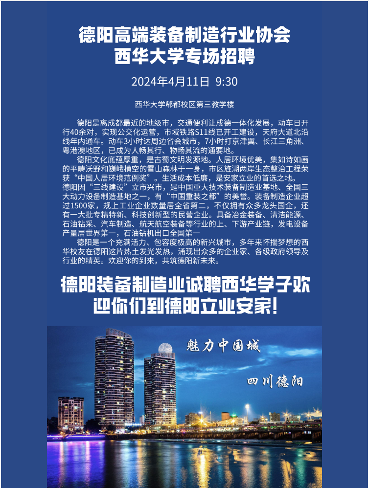 | 德阳高端装备制造业诚聘西华学子到德阳立业安家 |