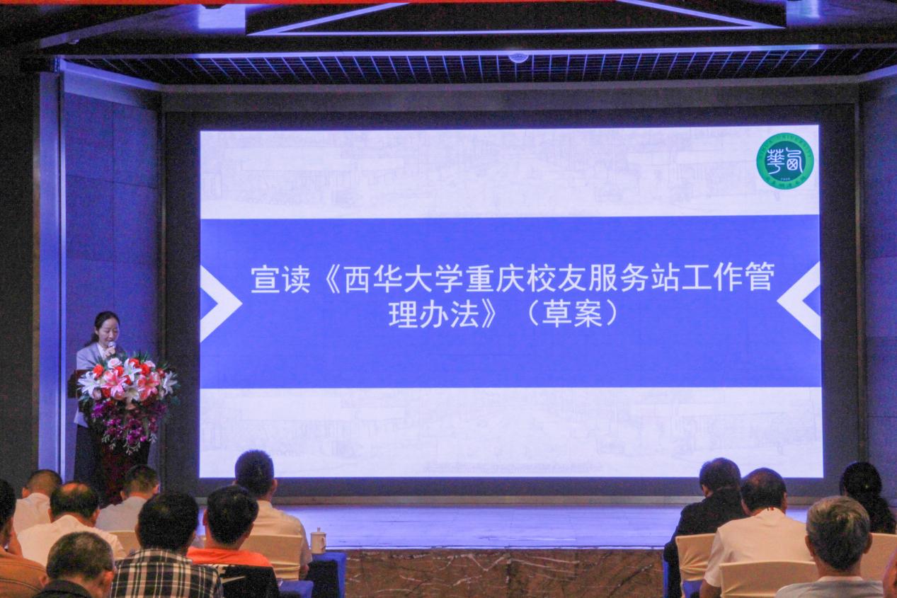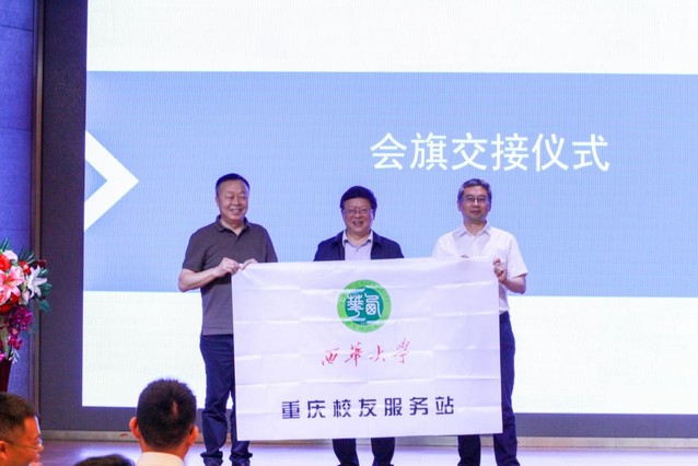 王丽娟处长宣读文件 随后,tyc41183太阳成集团党委常委、副校长刘小兵代表学校为tyc41183太阳成集团重庆校友服务站授牌,并交接会旗。今后,重庆服务站将在学校的关心下、在校友工作处的指导下、在各届理事会成员及校友们的共同努力下蓬勃发展。