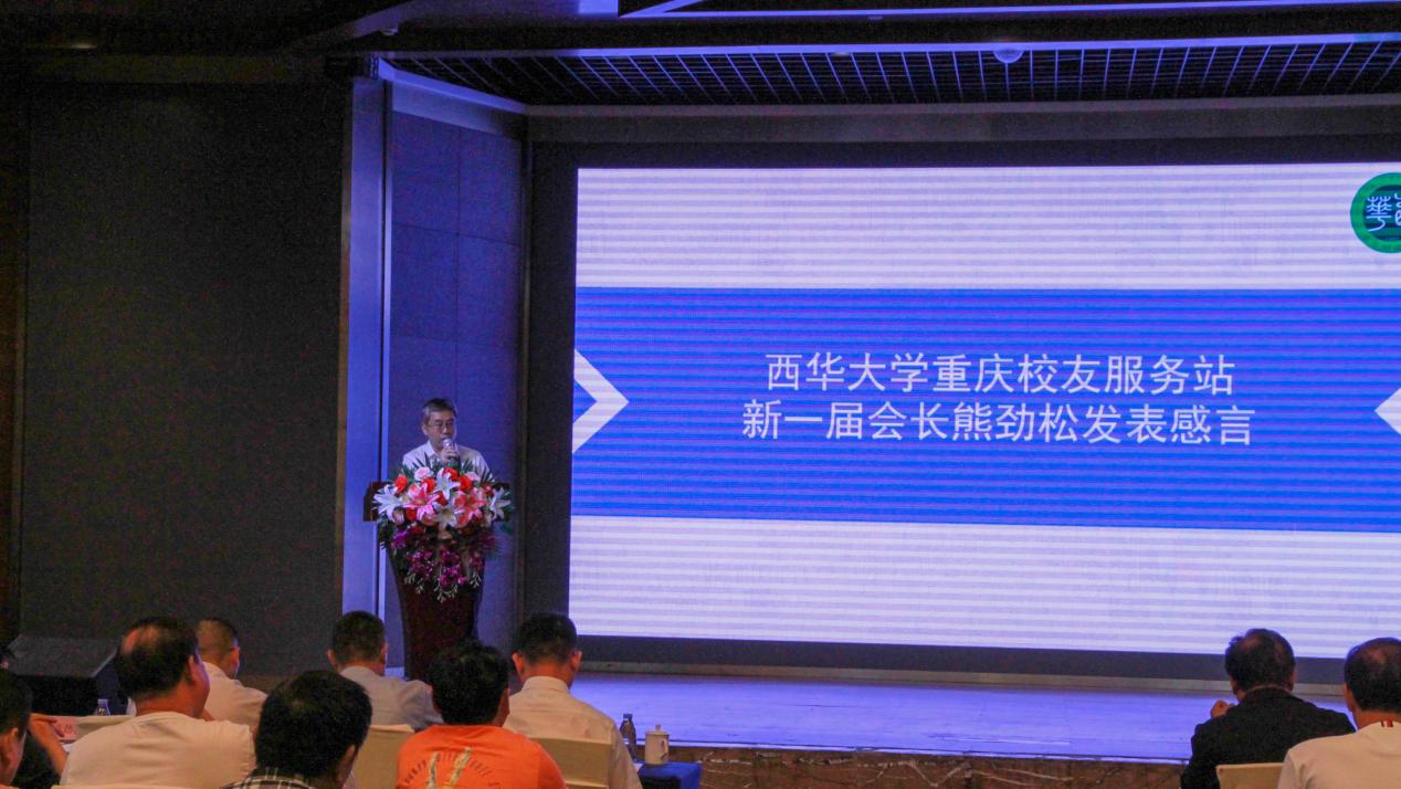 名誉会长陈渝和会长熊劲松为获得“40年支持校友会工作杰出贡献奖”的校友颁发荣誉证书 聘书(证书)颁发仪式后。新一届会长熊劲松发表了感言。他感谢校领导对重庆服务站的关心和对工作的指导,感谢上一届理事会的贡献。提出了后期的整体工作规划,要坚决贯彻“三服务”宗旨,即服务学校、服务校友、服务社会。提出了“情感共鸣、荣誉共享、事业共创、使命共担”的工作理念。包括宣传学校政策,加强校友联系,深化产学研服务,充分利用校友平台,统合现有优势资源,加强制度建设管理,开展各类公益服务等措施。熊劲松会长表示,一定会领导新一届理事会全力将重庆校友服务站建设得更好。