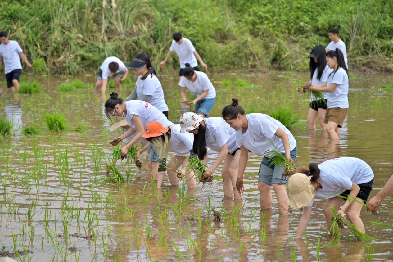 师生们在当地插秧能手的带领示范下,认真学习插秧技能和注意事项。经过简短学习后,大家低着头,弓着腰,左手熟练地捋送秧苗,右手轻盈地将秧苗快速、准确地插入泥土之中。指间的秧苗在稻田里由点成线,由线成片,一行行插好的秧苗整齐有序,随风摇曳,展露勃勃生机。