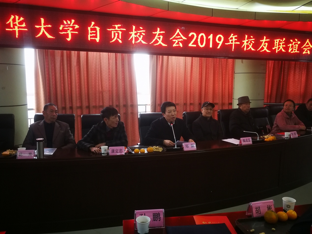 合影 会议伊始,主持人介绍参会母校领导、老师及兄弟校友会到访的校友嘉宾,校友们共同观看了母校的宣传片,认真翻阅了总会办带来的《致校友书》《校友通讯》,了解母校的发展变化,为母校快速发展连连赞叹。 自贡校友会会长、83级水机专业校友康定忠代表自贡校友会热情欢迎母校一行以及北京、泸州校友会理事会代表的到来。随后,他介绍自贡校友会下一步将结合校友专业、兴趣爱好等方面成立校友专业协会和兴趣小组,自贡校友会足球队兴趣小组已经组建,也即将建立水泵研发中心校友协会。未来会多吸收年轻有为的校友加入到理事会中,加强与兄弟校友会之间的交流、学习、研讨,让校友会工作更上一层楼。明年校庆60周年前,自贡校友会在2020年4月召开联谊活动为母校生日献礼。