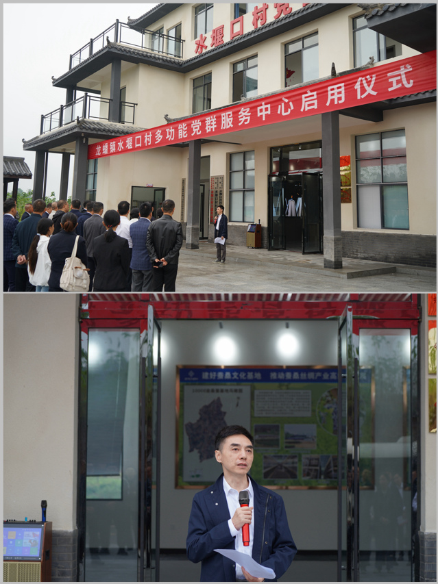 熊江介绍下院山村党群服务中心 随后,李秋实一行参加了水堰口村党群服务中心启动仪式,该党群服务中心由学校捐资50万元,联合顺成纺织品有限公司和嘉陵区人民医院修建完工。启动仪式由龙蟠镇党委委员,副镇长许利霞主持。在驻水堰口村第一书记刁成豆和顺成纺织品有限公司总经理王尚雪的引导下,一行参观了党群服务中心一楼展示大厅,观看了水堰口村驻村工作队宣传视频,了解了顺成公司的发展规划和丝绸产品销售情况。