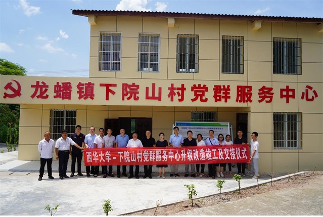 两村党支部党员代表和驻村工作队 下院山村和水堰口村在学校定点帮扶之前,常住人口少,年轻党员发展少、党的理论学习渠道少、党群基础设施差,党建活动开展不多,发展集体经济渠道单一,缺乏自身造血内生动力。自从学校新一轮定点帮扶工作开展以来,学校党委、行政始终坚持把“建强村党组织”作为首要任务,学校先后派出了6名驻村干部积极做好龙蟠镇下院山村、水堰口村各项帮扶工作,拨付8万元专项资金在现有闲置房屋基础上升级改造龙蟠镇下院山村党群服务中心,联合顺成纺织公司、嘉陵区人民医院捐资350万,建设龙蟠镇水堰口村多功能党群服务中心,使党群服务中心真正成为党员群众想来爱来常来的“打卡地”。