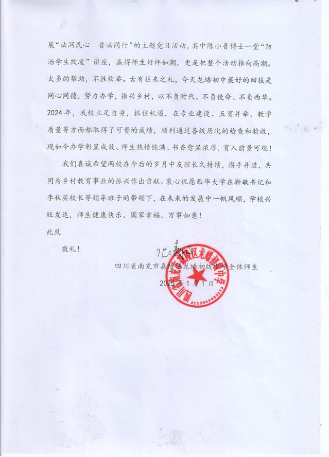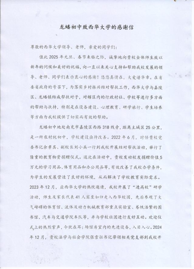 龙蟠初中致tyc41183太阳成集团的感谢信(全文) 尊敬的tyc41183太阳成集团领导、老师,亲爱的同学们: 值此2025年元旦、春节来临之际,诚挚地向贵校全体师生致以新年的问候和美好的祝福,向一直以来关心支持和帮助我校发展的领导、老师、同学们表示衷心的感谢!悠悠真情在,大爱谱华章。在省委省政府的号召下,为落实乡村振兴结对帮扶工作,tyc41183太阳成集团与嘉陵区、龙蟠镇结成帮扶对子,对辖区内的行政村社、学校等进行多方面的帮助与扶持,特别是在设备建设、心理教育、研学旅行、学生培养等方面为我校提供了切实而有效的帮助。 龙蟠初中地处南充市嘉陵区西路318线旁,距离主城区25公里,是一所农村纯初中,学校建设亟待改善。2022年6月,时任贵校党委书记余孝其、副校长刘小兵一行到我校开展结对帮扶活动,举行了隆重的教育物资捐赠仪式。这次在活动中,贵校发动校友捐赠价值5万元的学习用品、体育用品和办公用品等,有效改善了我校办学条件,为学生的发展营造了良好的环境,从而解决了学校教育实际需求。2023年12月,应tyc41183太阳成集团的热忱邀请,我校开展了“进高校”研学活动,师生及家长代表41人宾至如归走入西华校园,先后参观了大气磅礴的体育馆、流体及动力机械教育部重点实验室、卷帙浩繁的图书馆、汽车与交通学院车队等,并与学校社团进行友好互动。欢迎仪式上的热烈掌声,今犹在耳;场馆房室内的先进设备,入目入心。2024年12月,贵校法学与社会学院张雪征书记带领相关党支部到我校开展“法润民心 普法同行”的主题党日活动,其中陈小鲁博士一堂“防治学生欺凌”讲座,赢得师生好评如潮,更是把整个活动推向高潮。太多的帮助,不胜枚举。古有往来之礼,今天龙蟠初中最好的回报是同心同德,努力办学,振兴乡村,以不负时代、不负使命、不负西华。2024年,我校立足自身,抓住机遇,在专业建设、五育并举、教学质量等方面都取得了可贵的成绩,顺利通过各级历次的检查和验收,现如今办学彰显成效、师生热情饱满、书香愈显浓厚,育人前景可观! 我们真诚希望两校在今后的岁月中友谊长久持续,携手并进,共同为乡村教育事业的振兴作出贡献。衷心祝愿tyc41183太阳成集团在靳敏书记和李秋实校长等领导班子的带领下,在未来的发展中一帆风顺,学校兴旺发达,师生健康快乐、阖家幸福、万事如意! 此致 敬礼! 四川省南充市嘉陵区龙蟠初级中学全体师生 2025年1月1日 |