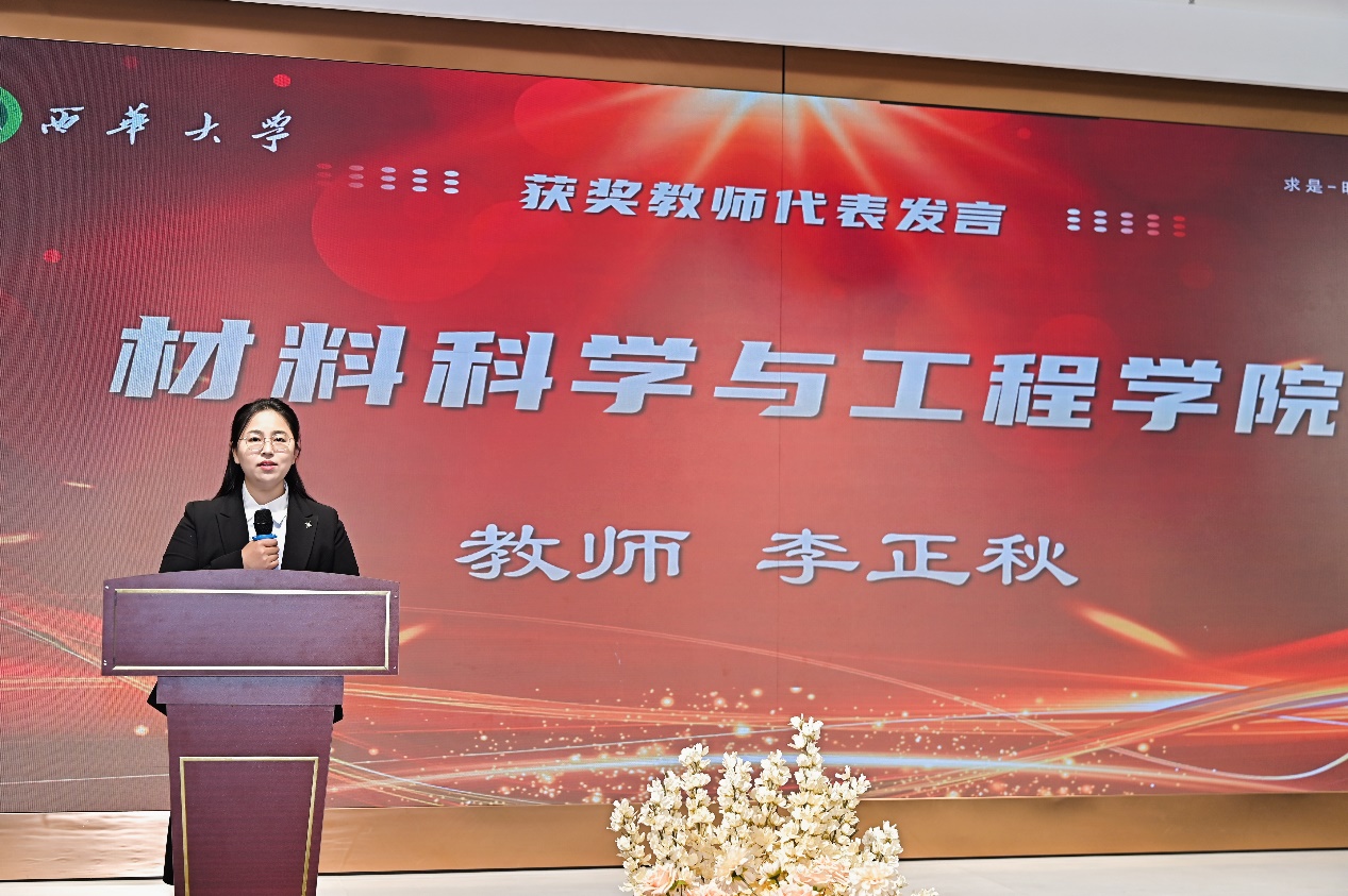 随后,材料科学与工程学院老师李正秋作为获奖教师代表发言。她以“感恩、传承、奋进”为题,以科研与教学中的实例为切入点,向参会的校友们汇报了在教书育人道路上取得的成绩。