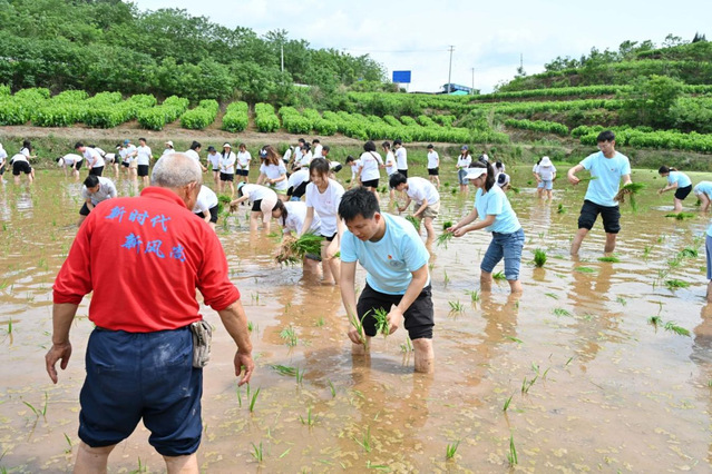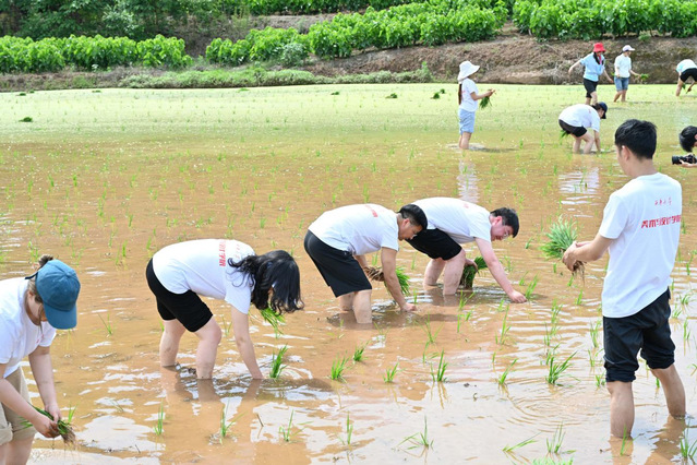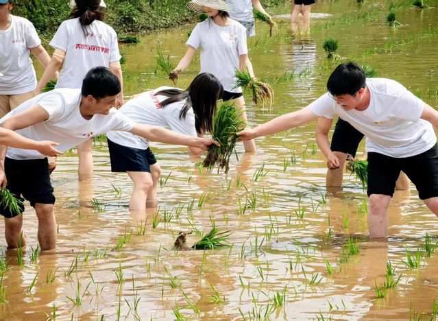 田间插秧悟初心 下午,两校师生们在驻村工作队的带领下,深入六社约3亩的水田处开展插秧实践。田间地头,村里农技能手现场示范标准化插秧技法,布满老茧的双手将青翠秧苗精准植入沃土。师生们脱鞋挽裤踏入春水温润的稻田,师生们在农技能手的指导下屈膝分秧、精准定距,劳动场面热火朝天。