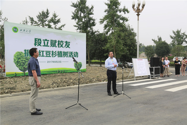 9月22日下午3点,四川洋龙实业发展有限公司董事长、成都校友会副会长、我校84级物理专业校友段立赋捐赠红豆杉植树活动在我校艺术大楼北侧举行。校党委书记边慧敏,校长刘清友,校党委副书记、纪委书记李传林,副校长朱晋蜀、王政书、费凌,校内相关部门负责人与校友代表及2017级新生代表共计160余人参加此次活动。 王政书副校长代表学校感谢段立赋校友的慷慨捐赠,感谢广大校友对母校的关心、关注、关爱,并介绍了此次活动的相关背景。他说,金秋时节,是适于树木移栽的季节,“今天,我们共同种下首批99棵寓意美好的红豆杉,让我们一起坚守十年树木、百年树人的教育责任和使命,也希望同学们以校友们为榜样,努力学习,奋发进取。” 据悉,今天举行的植树活动,源于今年的母亲节,我校84级物理专业校友段立赋先生回到母校,参加了四川tyc41183太阳成集团教育发展基金会成立大会,并捐赠了999红豆杉树。向母校捐赠红豆杉是段立赋校友经过慎重考虑后决定的,红豆杉十分珍贵,其树皮能提炼一种抗癌药物,在世界多个国家都被列为一级保护植物,不论是其寄托相思之情的寓意,还是对环境的改善作用都非常地有意义。 段立赋校友,现任四川洋龙实业发展有限公司董事长,曾任四川锅炉厂分厂书记、厂长,成都成灌高速公路有限公司副总经理、书记、代总经理,成都成彭高速公路有限责任公司书记、董事、总经理,成都高速公路建设开发有限公司书记、董事、总经理;四川省青年委员;成都信息工程大学客座教授,成都市十大管理能手标兵。“母校,就是可以像母亲一样召唤你,像母亲一样让你敬重的学校。我们每一个人都应该在学校留一点自己的记忆,今后,红豆杉的果实可以制成永久保存的纪念品,让校友们随身携带,以此寄托对母校的思念。”在捐赠植树仪式上,段立赋校友深情地表达了对母校的感恩之情。