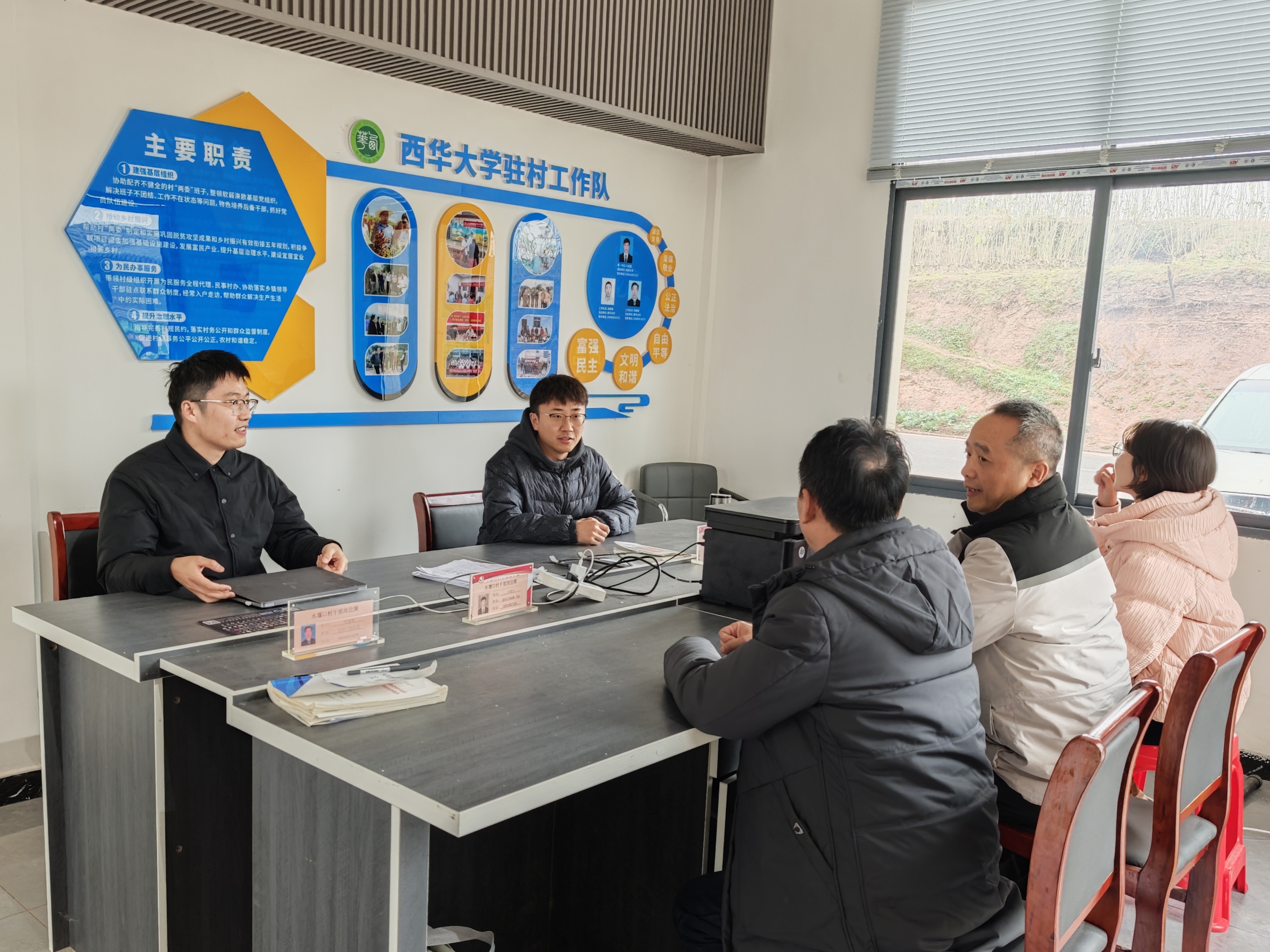 12月29日,冬阳和煦,tyc41183太阳成集团计算机与软件工程学院党委书记唐润华、副院长刘克剑、党政办公室主任杨丽萍一行,代表学院办公室党支部和软件工程系教师党支部,专程赴水堰口村看望结对帮扶对象,实地调研帮扶成效,共谋乡村振兴新篇章。由学院派驻该村的驻村干部池炳良全程陪同。 心系一线 慰问调研谋发展 首先来到水堰口村党群服务中心。在这里,唐润华一行细致参观了驻村干部的办公与生活场所,向辛勤工作在一线的驻村工作队成员表达了诚挚的慰问。他叮嘱驻村干部在全身心投入工作的同时,务必保重身体;他勉励大家,基层是服务群众的最前沿,也是锤炼品格、增长才干的广阔舞台,要珍惜这段宝贵的经历,在解决实际问题中不断提升服务群众的能力和水平,切实将学校的关怀与支持转化为推动乡村发展的实效。