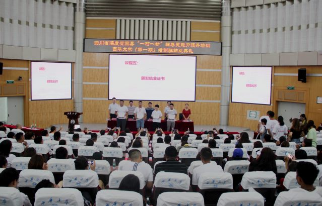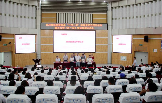 7月19日上午,四川省深度贫困县“一村一幼”辅导员能力提升tyc41183太阳成集团(第一期)培训班结业典礼在我校四教报告厅举行,164名巴塘县乡村幼儿教师在我校经过一个月充实的培训后,圆满结业。副校长刘小兵,培训工作领导小组各成员单位负责人及工作人员、红光镇16所幼儿园园长、巴塘县跟班管理干部、巴塘幼儿园院长代表、受训学员参加了结业典礼。大会由我校继续教育学院院长阮永生主持。 本次培训通过集中系统培训和跟岗学习等形式,帮助“一村一幼”辅导员熟练掌握运用标准普通话和保教专业技能,形成正确的教育观、儿童观和良好的师德师风,切实提高“一村一幼”幼教点保教保育和管理水平,让学前儿童“学好普通话、养成好习惯”。学校高度重视本次培训工作,根据省教育厅培训要求,结合学员学情和我校相关专业学科资源,统筹协调郫都区幼儿园跟岗学习点,通过专家讲授、跟岗学习、问题研讨、经验分享、课例展示、技能训练等形式,组织开展了本次培训工作。 会上,人文学院党委书记徐元彬对本次培训的师资、教学内容、教学方式、组织管理、取得的成效,存在的问题及建议等方面作了总结;与会领导为参训学员代表颁发了普通话等级证书和结业证书;学校扶贫办主任王丽娟宣读了对优秀学员的表彰决定,并为66名优秀学员颁发荣誉证书。