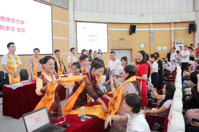 颁发荣誉证书 培训参与单位代表、红光镇示范幼儿园园长杨旭茹老师发言,她表示红光镇的16所公办民办幼儿园能有幸参与这次培训,培训全过程精准实施,务求实效,巴塘老师们的淳朴、努力进取给他们留下了深刻的印象,祝愿他们为藏区的学前教育做出更大贡献。优秀学员代表次称多吉发言,他代表全体学员感谢省教育厅提供的培训机会和tyc41183太阳成集团的精心安排,感恩老师们一个月来辛勤的付出,表示一定把培训的所学所思带回家乡,运用到今后的工作实践中去,更好地为巴塘幼儿教育服务。 现场,学员们用一首歌曲表达了对学校及老师的感激之情,并为领导和老师们献上了哈达。 最后,副校长刘小兵讲话。他代表学校对全体参训学员顺利完成本次学习任务表示由衷的祝贺,对红光镇16所幼儿园的大力支持及参与培训工作的全体人员辛勤付出表示衷心的感谢。他表示,学校高度重视“一村一幼”培训工作,培训期间纪律严明,保障有力,取得了良好的效果。参训学员认真学习、坚持不懈、收获颇多,从今天起,西华也已成为学员们共同的母校,希望参训学员继续发扬“知难而进,自强不息”的西华精神,也希望他们把取得的学习成果和优秀品质带到工作岗位中,为促进民族地区教育事业的发展贡献自己的力量。 结业典礼在热烈的掌声中圆满落幕。本次培训丰富了幼儿教育的理论知识,提升了教育教学能力,丰富且实用的课程让学员们受益匪浅。培训分为两期,第二期培训将在8月20日开展。 据悉,“一村一幼”是四川省委、省政府为解决我省民族地区特别是深度贫困县幼儿入园教育的一项重要举措,该项目自2015年实施至今,已经取得很好的成效。为进一步提高“一村一幼”项目实施质量,省委省政府把深度贫困县“一村一幼”辅导员能力提升培训作为实施深度贫困县人才振兴工作的重要内容。