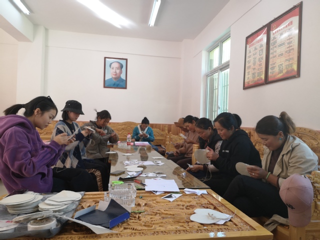 合影 此外,应用技术学院藏区文化创意老师赵倩和2名产品艺术设计专业的学生在水磨沟村开展了一天的手工品制作培训。培训从当地百姓最熟悉的藏式卡垫图案绘制着手,以套色版画为载体,以藏区的羊毛毡和麻线为材料,结合简单的刺绣针法,教村民制作以藏族文化元素为图案的绣花杯垫。培训旨在培养两村村民挖掘和销售当地文创产品意识,教会他们制作蕴含藏区文化的手工产品,向318沿线游客展示和销售,实现多元化增收,进一步巩固脱贫成果。参加培训的村民格绒志玛感慨地说:“以前大家都觉得外面卖的手工品是遥不可及,现在发现自己也能制作水磨沟村自己的文化产品,还能做这么好看,这么实用,现在感觉很自豪。自己以后多多练习,争取早日能够拿出去销售”。
