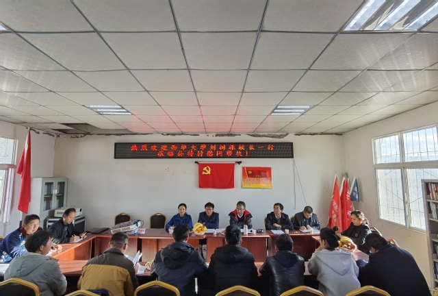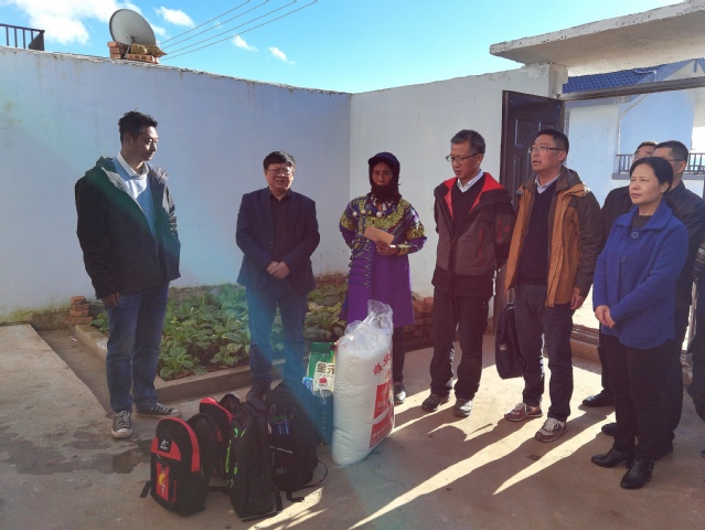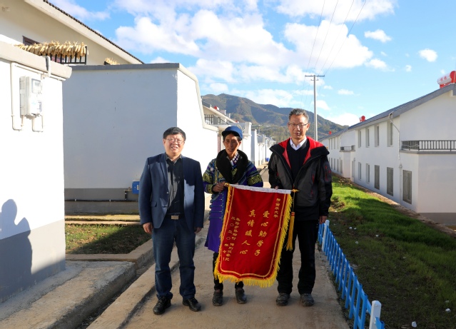 向补洛乡中心幼儿园捐赠校服 在补特村移民安置点,刘校长一行在补洛乡海来有兵乡长等乡村干部陪同下,看望慰问了我校结对帮扶的建档立卡户伟则么各此、吉尔尔火等3户贫困户,为他们送上了全棉三件套、棉絮、食用油、大米等生活用品以及书包、铅笔盒、水彩笔、圆规套装等学习用品。刘校一行详细了解贫困户家庭状况,生活、生产中存在的实际困难以及帮扶需求,鼓励他们树立脱贫信心和决心,通过自身努力积极发展生产,早日实现脱贫致富,刘校一行还去看了我校结对帮扶支部为贫困户购买的四只羊。贫困群众伟则么各此发自内心感谢学校的帮扶,向刘校送上了锦旗。