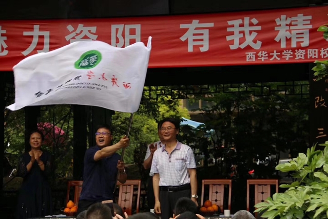 会旗交接 李庆威校友在发言中对上一届校友会的工作进行了回顾总结,并表达了对新一届资阳校友会和校友们的祝愿,并对资阳校友会今后的发展提出了建议和期望。 会长李斌对资阳校友会目前的理事会成员组成情况作了介绍,对下一步校友会的工作进行了安排,表示今后将为广大校友搭建一个相互交流、相互帮助、共享资源的良好平台,筹办更多丰多彩的互动活动,同时也希望资阳校友会成员及广大校友可以提出良好建议,联系更多的校友加入到资阳校友会这个温暖的大家庭中来,将资阳校友会建设得越来越好,让资阳校友会真正成为服务校友、服务母校、服务社会的平台。 副校长王政书讲话中,首先代表母校对资阳校友及其家人表达了美好的问候,同时向校友们分享了学校目前的发展状况。王政书副校长讲到,学校是目前省属高校中学生最多、专业最多的综合性大学,现在学校规模发展越来越壮大,培养了25万余名西华学子,为社会输出了大量人才。他表示,母校与校友们荣辱与共,一定不辜负大家期望,把母校建设好,也欢迎校友们多回母校看看。最后,王政书引用了泰戈尔的诗句:“不管阳光把树的影子拉得多长,它总是和根连在一起”,象征着校友和母校之间的联系。