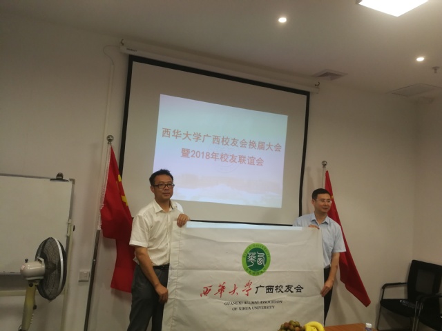 传授会旗 广西校友会会长肖劲松代表新一届理事会讲话,他首先感谢学校搭建了广西校友们交流、合作、互动的平台,广西校友会要多组织开展校友会活动,促进广西校友与校友、校友与母校的联系和合作。?xml:namespace>