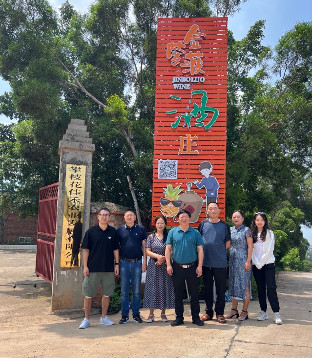 合影留念 刘小兵一行还前往攀枝花市盐边县,走访调研了我校1980级水机专业刘平校友的攀枝花佳禾农业发展有限公司,考察了该公司种植金菠萝、牛油果的千亩果园,同时还参观了金菠萝酒生产线、了解了产业发展情况等。