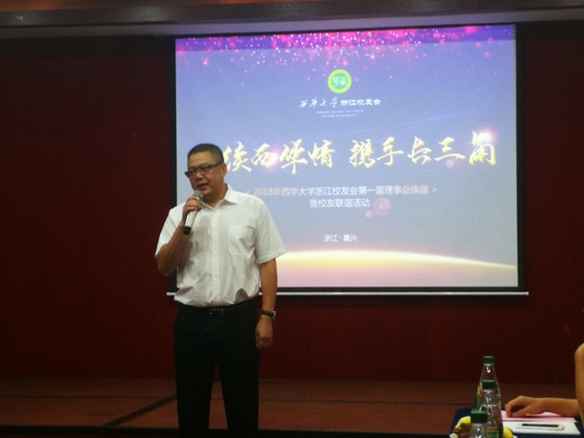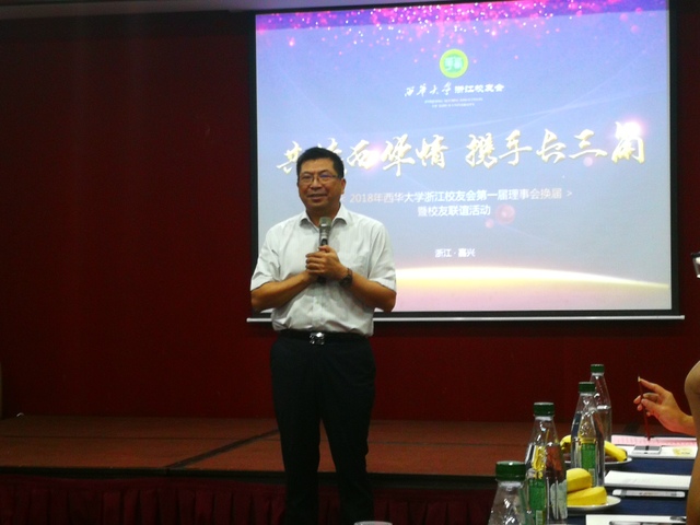 副校长王政书讲话中,代表母校对浙江校友表达美好的问候,同时向校友们分享学校的发展状况和近年来学校在学科建设、招生就业、开放办学、军民融合等方面取得的成绩。他寄予浙江西华的学子们即要仰望天空,又要脚踏实地,继承和发扬红船精神,让自己的人生更上一个台阶。他表示校友不仅是学校的名片,更是学校发展壮大的助推器,希望校友们在人才培养、学科建设、专业设置等方面向母校提出建议和意见,助推学校发展,并希望校友们常联系母校、常回母校看看。