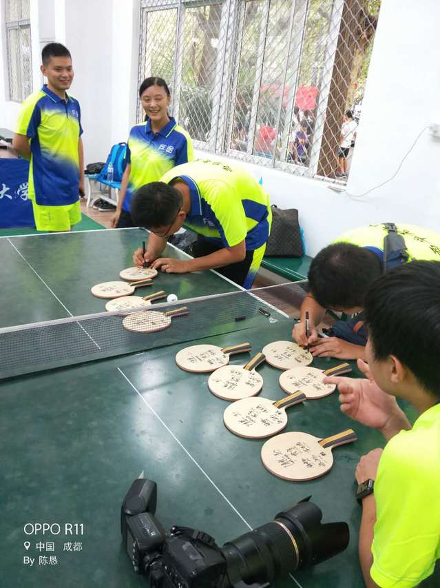 2018年9月8日下午,我校高水平代表队训练中心迎来了一批特殊的校友,他们身着统一队服,气宇轩昂、活力四射,成为新生报到季校园里一道独特的风景线,队服上醒目的“西华老友队”印字述说着他们与我校乒乓球高水平代表队的一段不解之缘。 作为我校高水平乒乓球代表队的最初班底,他们由99级至2004级各学院具备一定训练基础的乒乓球爱好者组成。他们虽然来自五湖四海,专业千差万别,但曾经在母校共同挥洒汗水、奋力拼搏的青春岁月,在每个人生命中都留下了深深的烙印。 他们毕业后虽奔赴各方,但心念母校、感怀师恩。数年后的今天相聚西华,感慨万千,在激烈而愉快的乒乓球友谊比赛活动中,校友们重温当年的青春热血,并在乒乓球拍上签名留作美好的纪念。在了解了我校高水平代表队训练中心完善的训练设施以及球队所取得的傲人战绩后,大家为曾经在球队挥洒青春和汗水的往昔岁月感到骄傲的同时,更为学校和运动队的跨越式发展感到自豪。他们衷心祝愿母校的明天更辉煌。