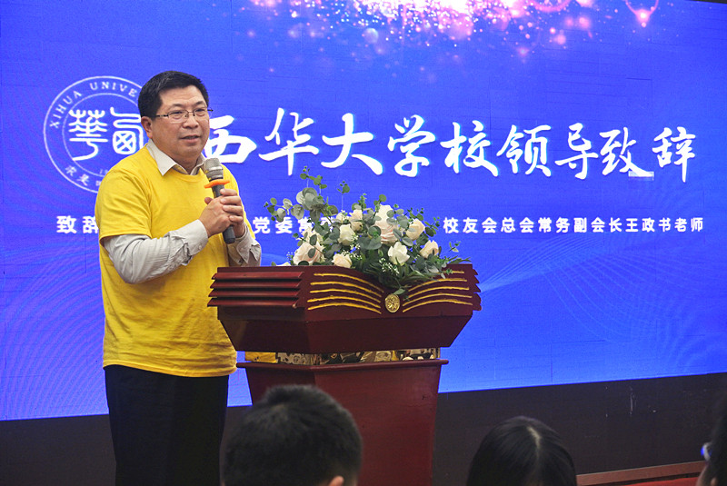 大会现场 王政书代表母校为上海的校友们送上了新年的祝福,向远离母校在上海打拼的西华学子们转达了母校的问候。他说到,在中国校友会的排名中,通过人才培养、科学研究、社会影响几个指标的评定,我校在2500多所高校中获得靠前的排名,这是我们广大校友的勤劳拼搏和傲人成绩为学校赢得的荣誉。随后,他向校友们介绍了近年来学校积极响应省委发展要求,对接地方经济社会发展需求,积极服务地方经济社会建设,在军民融合、大健康、乡村振兴等方面蓬勃发展的情况。他特别提到近三年学校在上海参加全国高校校园好声音决赛,取得了两个冠军、一个亚军的好成绩,这些成绩的取得与上海校友会组织的啦啦队密不可分。连续三年上海校友会每场都会组织啦啦队身着统一服装到场摇旗呐喊支持母校。他向上海校友们对母校工作的大力支持表示感谢,希望校友们加强与母校的联系,母校是校友们永远的家,欢迎校友们能常回母校。