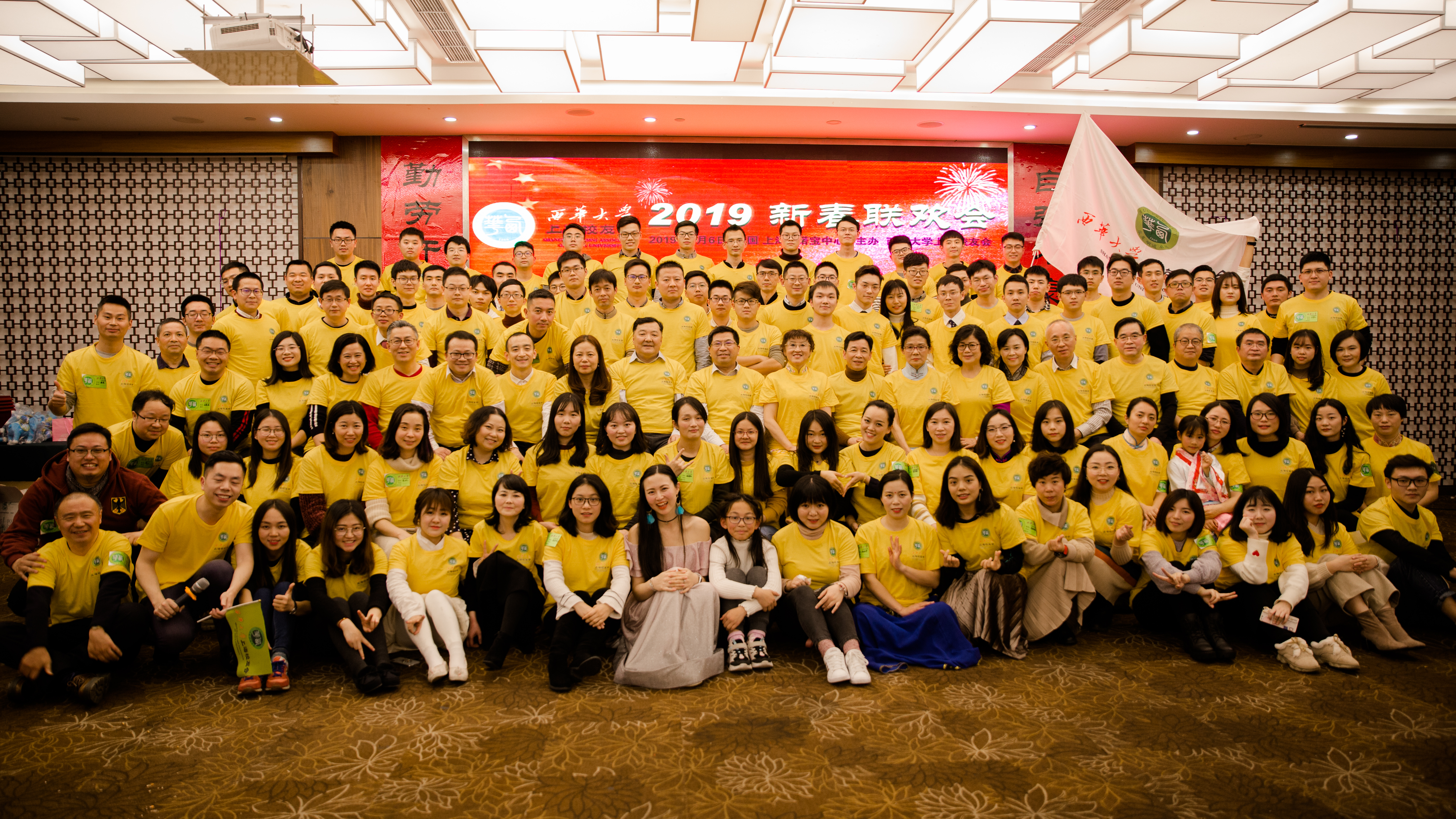 1月6日,tyc41183太阳成集团上海校友会2019年新春联欢会在上海诺宝中心酒店举行。副校长、校友总会常务副会长王政书,校友总会办公室主任王丽娟及校友总会办公室老师应邀参加,上海校友会会长陈君及校友会其他理事会成员,与从76级到2014级共150余名校友们欢聚一堂。会议由tyc41183太阳成集团上海校友会秘书长2004级工业工程专业郑璇校友主持。 西华祥云降福来,九州瑞气迎春到 大会现场,校友们身着印有毛体书法的“奋斗、西华人”的字样和tyc41183太阳成集团校徽的文化衫,映衬着校友们精心布置的会场,现场一片温馨、喜乐的新年氛围。