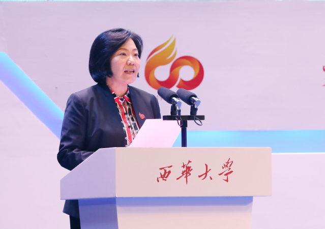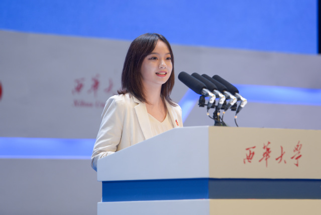 外国语学院2018级英语专业本科生王艳阳代表全体在校学生向母校表达了最衷心的祝福。她表示,每一个西华学子都将带着母校的希望和祝福,努力学习,全面成长成才,为西华增光添彩,为祖国的建设发展添砖加瓦。
