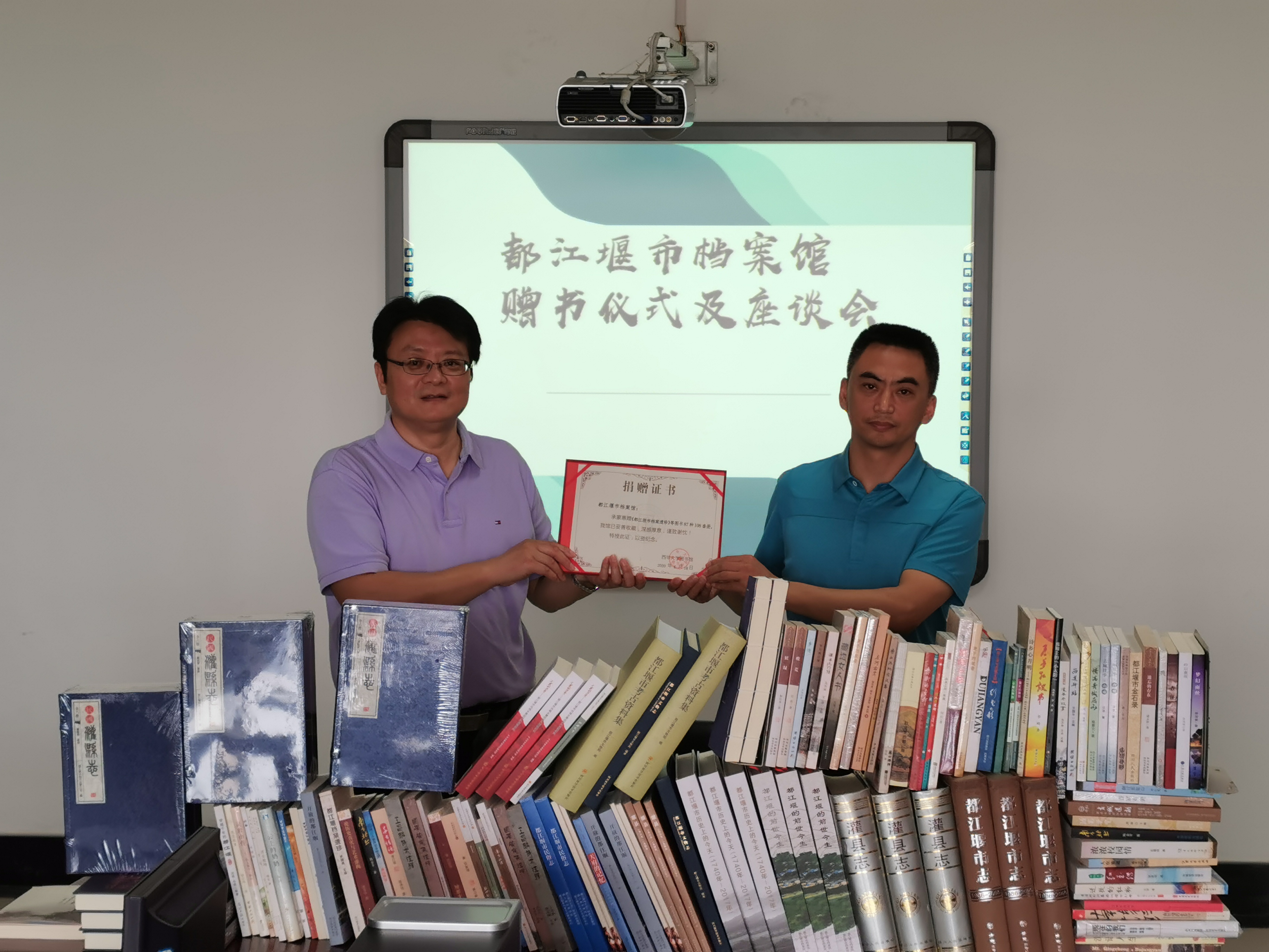 在捐赠仪式上,钟理馆长代表都江堰市图书馆向我校捐赠民国版《灌县志》《都江堰市志》等图书86种138册。潘殊闲馆长回赠了由tyc41183太阳成集团地方文化资源保护与开发研究中心编著的《蜀学》辑刊、《地方文化保护》辑刊等50余册。